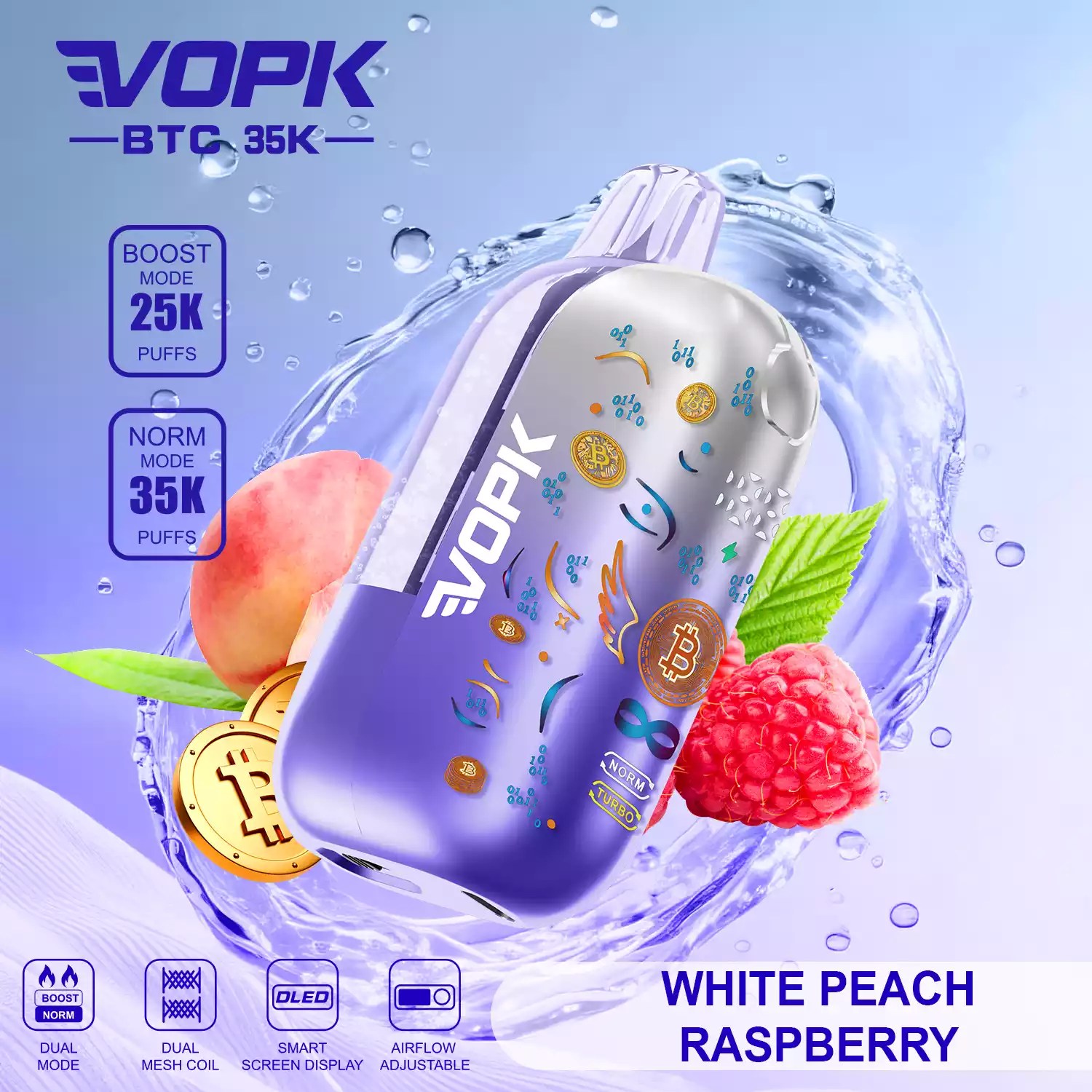 Hightech 35.000 puff VOPK BTC 35K wegwerpvape met slim scherm, dubbele mesh-spoel en instelbare luchtstroom. Perfect voor vape-winkels en groothandels die op zoek zijn naar hoogwaardige apparaten met een lange levensduur.