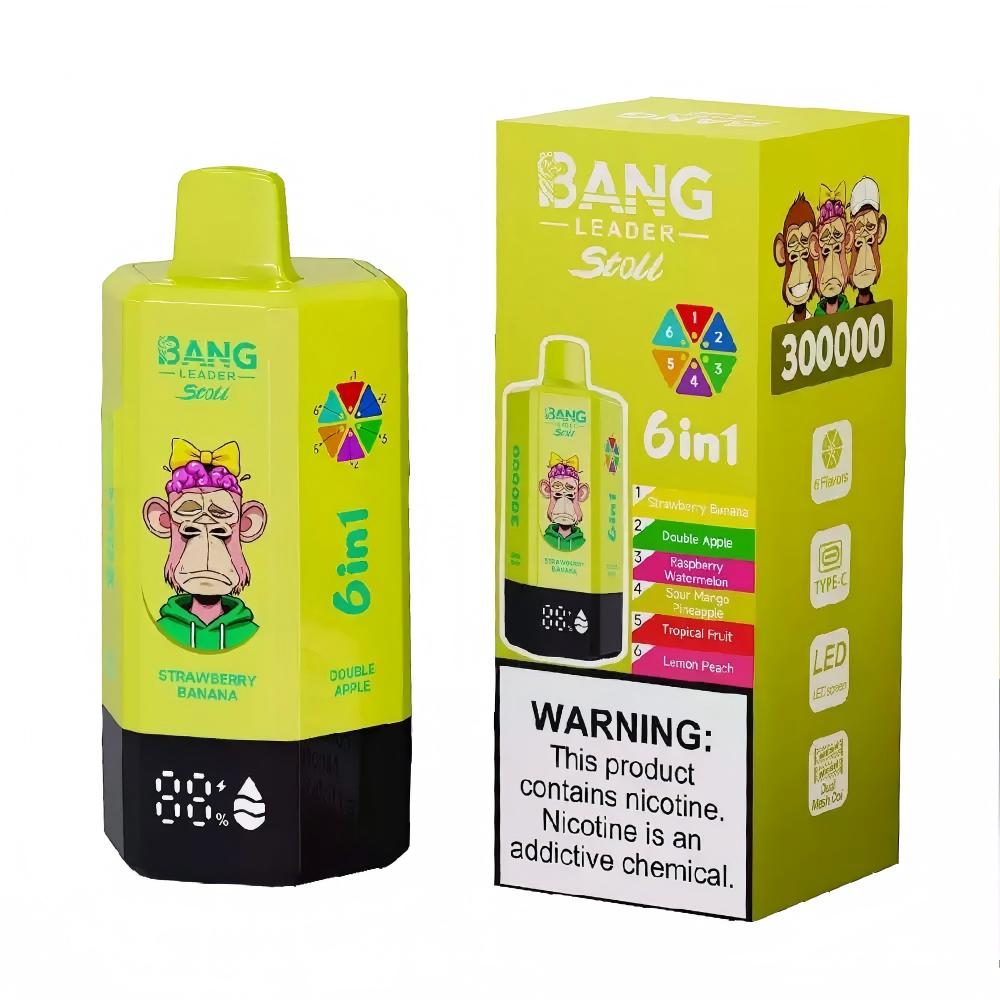 BANG LEADER STOLL 300K disposable vape with massive 300,000 puffs, 6-in-1 switchable flavors, rechargeable battery, and mesh coil. Ideal for wholesale, bulk buyers, and vape shops.