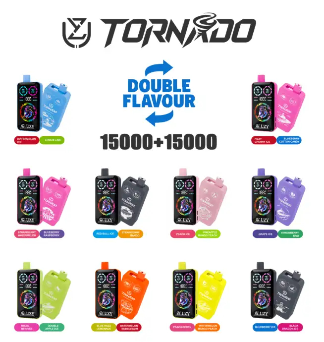 UZY Tornado 30000 puffs brings you massive clouds, powerful performance, and two flavors in one device. With a dual-compartment oil tank, adjustable power, 1.0Ω mesh coil, and a stunning RGD display screen, this device combines style, technology, and long-lasting satisfaction. Ideal for both retail customers and wholesale bulk buyers. 🔥